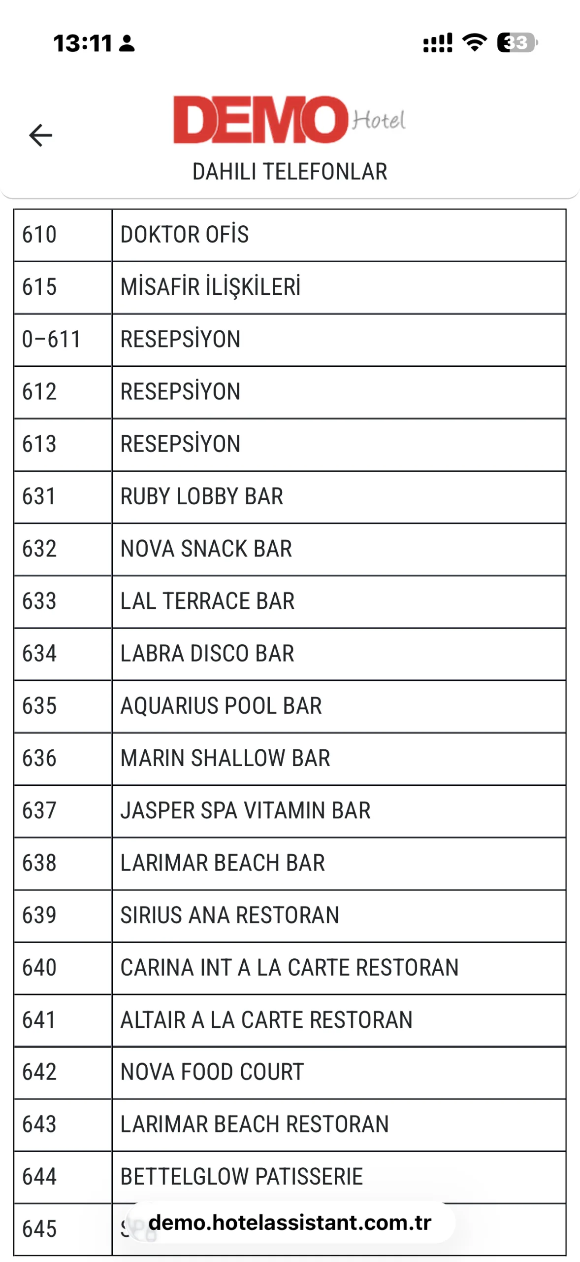 Misafirler, odalarından doğrudan otel içerisindeki dahili telefon numaralarına kolayca ulaşabilir. Resepsiyon, spa, bar, restoran ve diğer tüm birimlerin iletişim bilgileri tek ekranda düzenli şekilde sunulur.