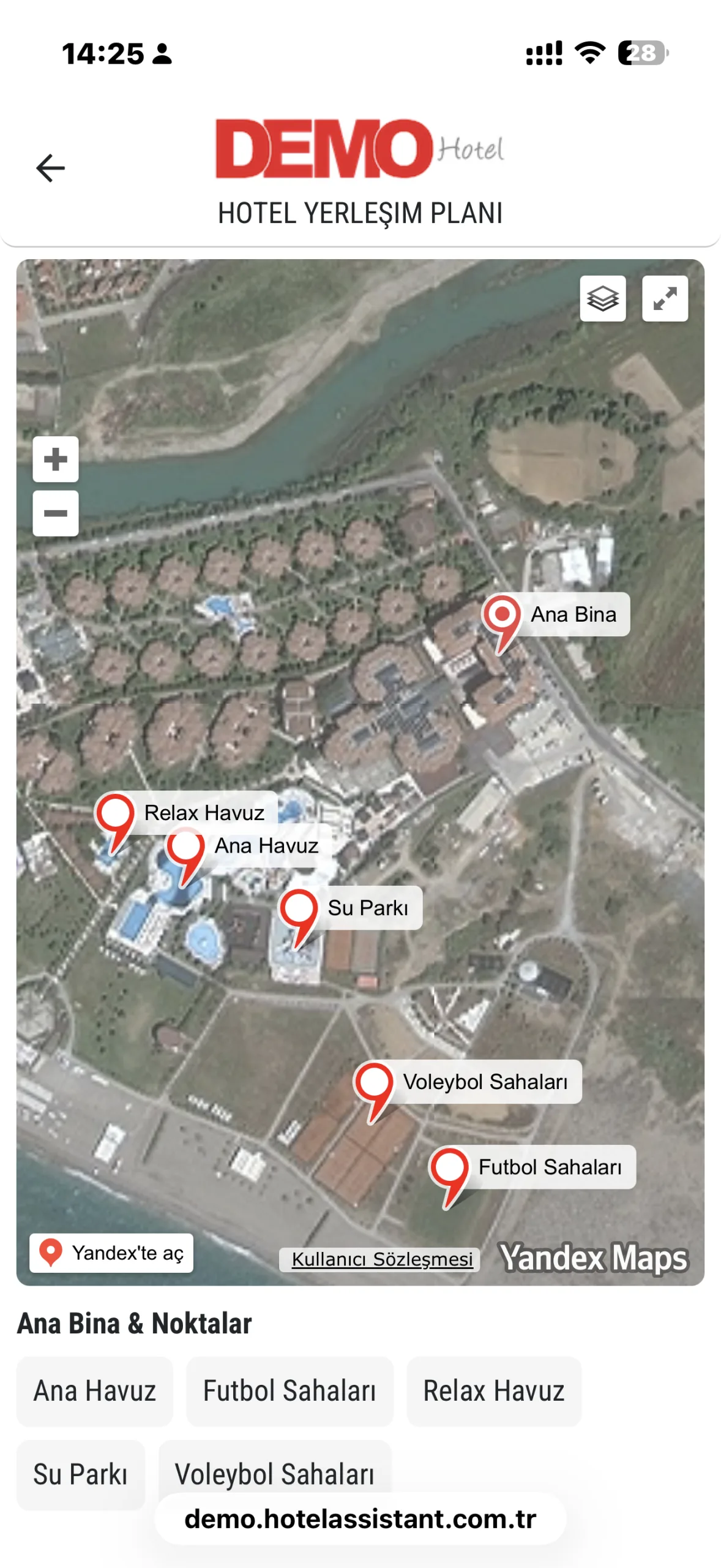 Hotel Assistant ile misafirler, otelinizin yerleşim planını kolay ve anlaşılır şekilde görüntüleyebilir. Entegre Yandex Haritalar altyapısı sayesinde otelin genel konumu, çevresi ve alan yerleşimi net bir şekilde sunulur.