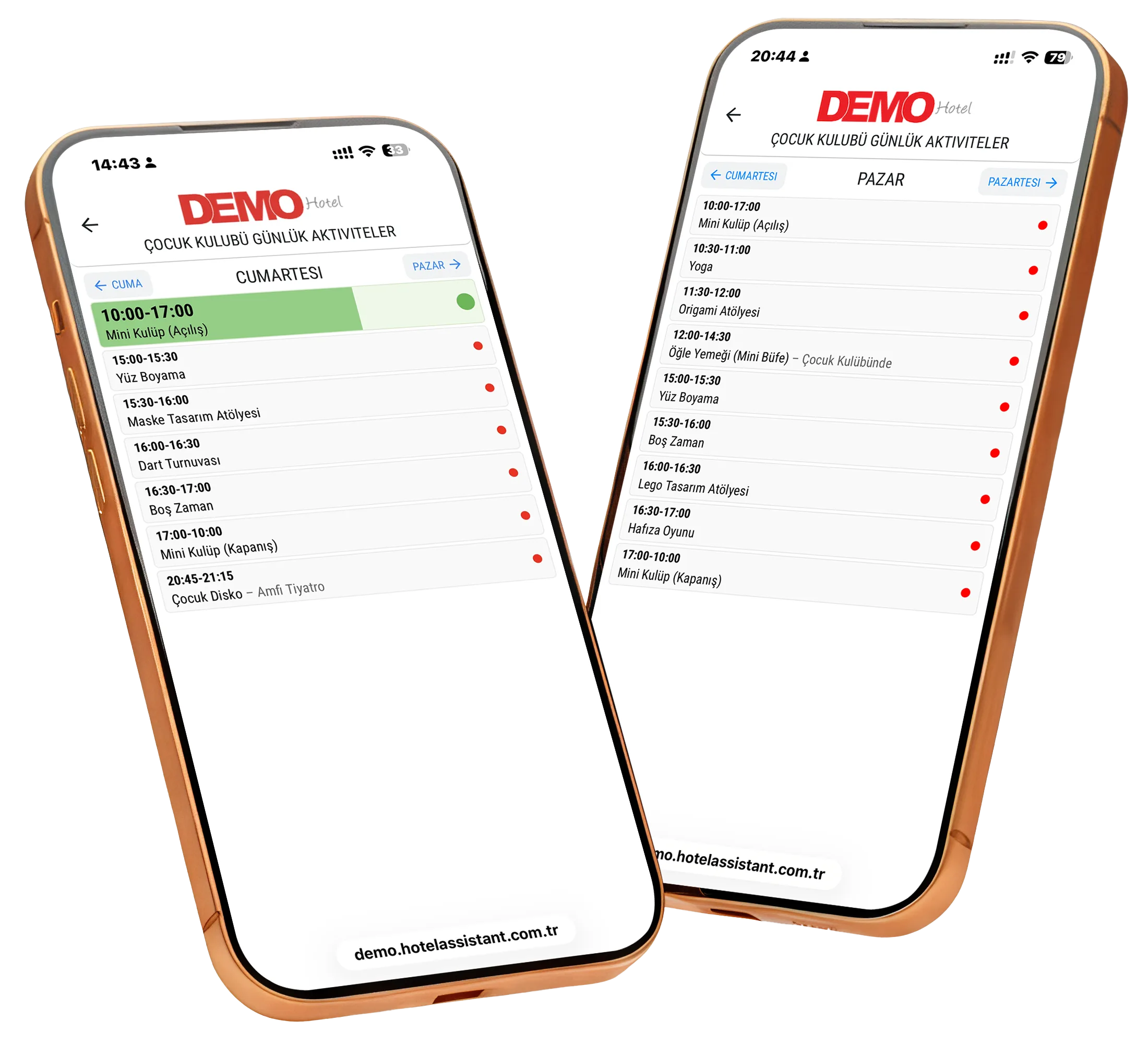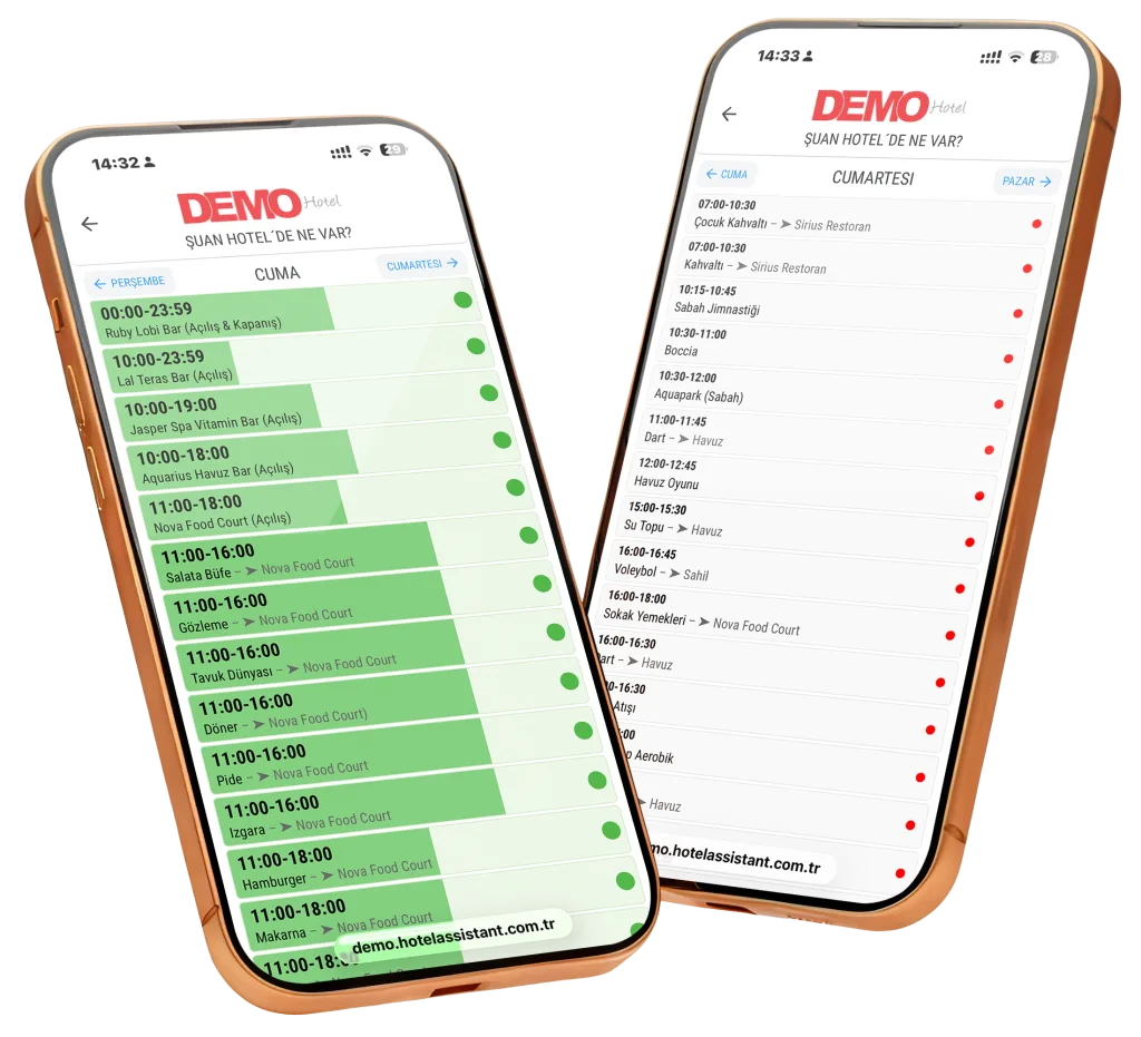 Yaz sezonu boyunca misafirler, otelde gün içinde gerçekleşen tüm anlık hizmetleri, etkinlikleri ve programlarıkolayca takip edebilir. Animasyonlar, spor aktiviteleri ve eğlenceler tek ekranda sunularak misafirlerin yaz tatilini daha planlı ve keyifli hale getirir.