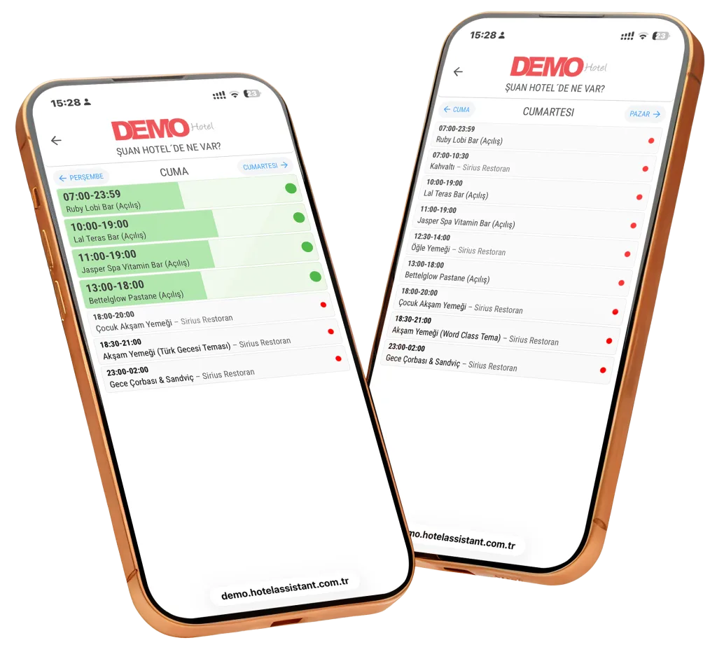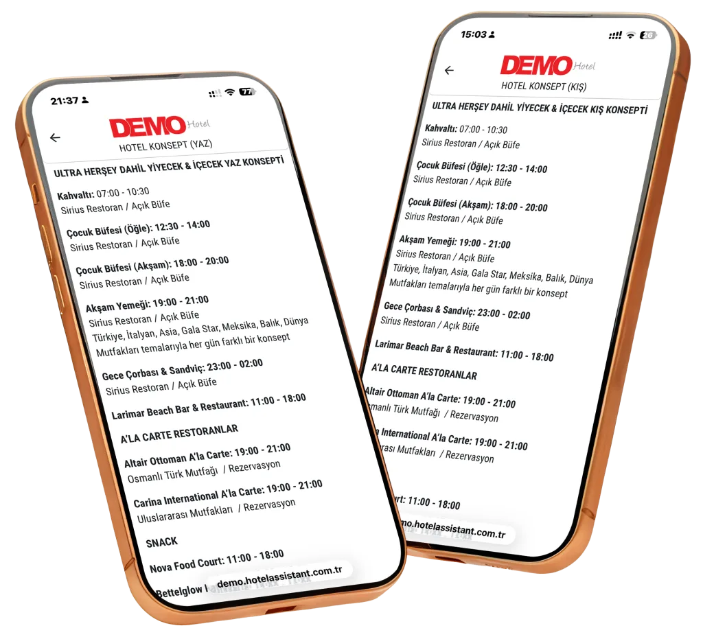 Misafirler, konaklamaları süresince hangi sezon konseptinin geçerli olduğunu kolayca görüntüleyebilir; hizmet saatleri, içerikler ve kullanım koşulları hakkında doğru ve güncel bilgiye tek ekrandan ulaşır. Yaz ve kış konseptlerinin ayrı ayrı oluşturulabilmesi, bilgilerin karışmasını önler ve misafir bilgilendirmesini daha net hale getirir.