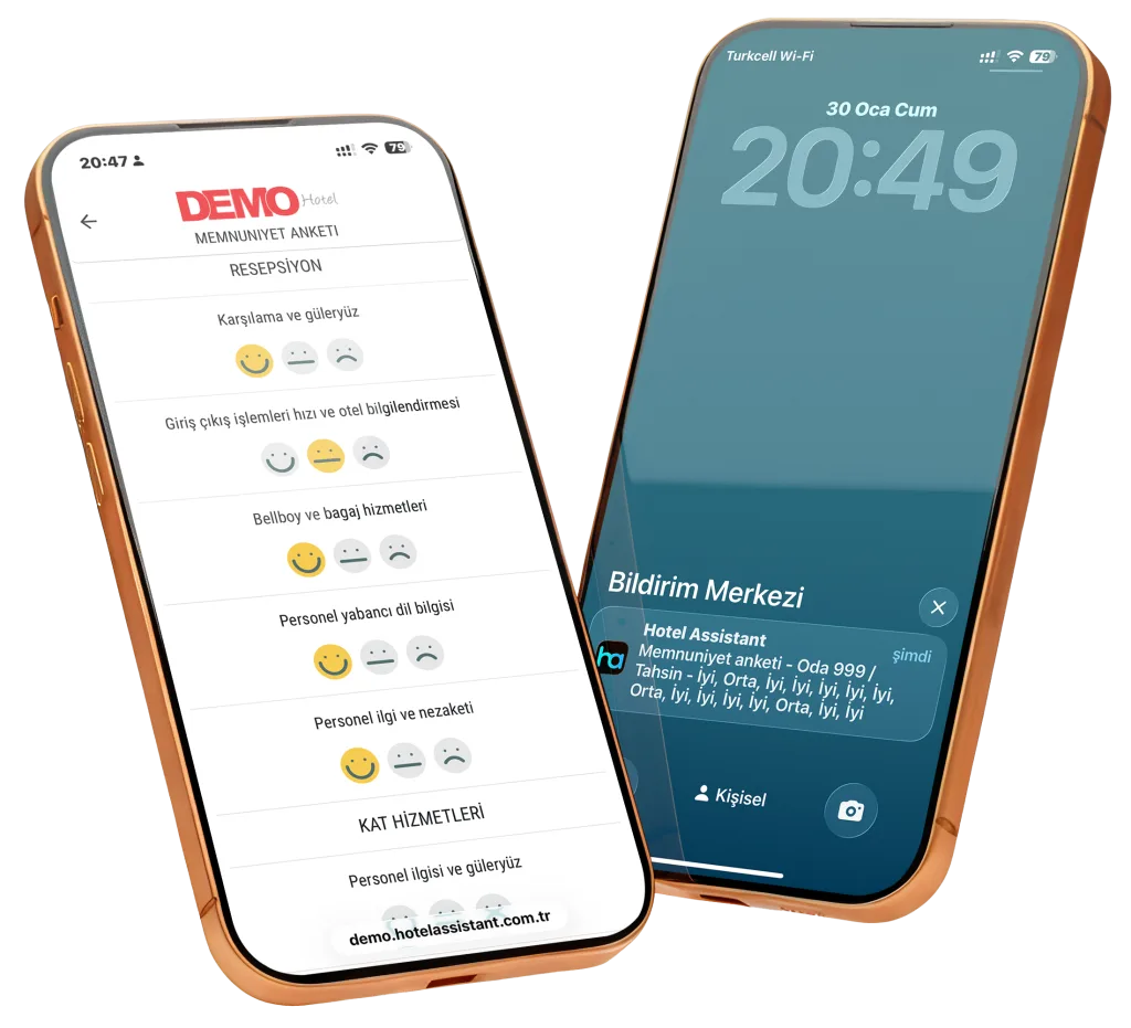 Hotel Assistant, memnuniyet anketlerini dijital ortamda sunarak geri bildirim sürecini hızlandırır, ölçülebilir veriler elde edilmesini sağlar ve hizmet kalitesinin sürekli iyileştirilmesine katkı sunar. Bu modül, misafir memnuniyetini şeffaf ve sürdürülebilir bir şekilde yönetmenin etkili bir yolunu sunar.