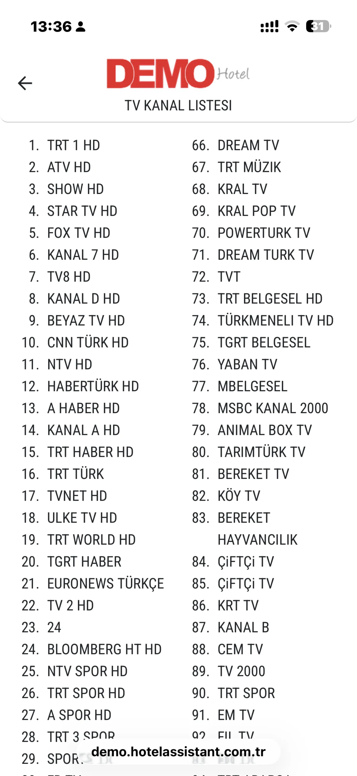 Hotel Assistant ile misafirler, odalarında sunulan tüm TV kanallarının listesini tek ekrandan kolayca görüntüleyebilir. Kanal listesi sayesinde hangi kanalların mevcut olduğu ve her bir kanalın hangi numarada yer aldığı açık ve anlaşılır şekilde sunulur.