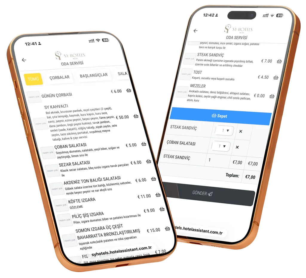 Evet (otel ayarına göre). QR ile veya masa numarası girerek sipariş oluşturulur ve ilgili birime iletilir.